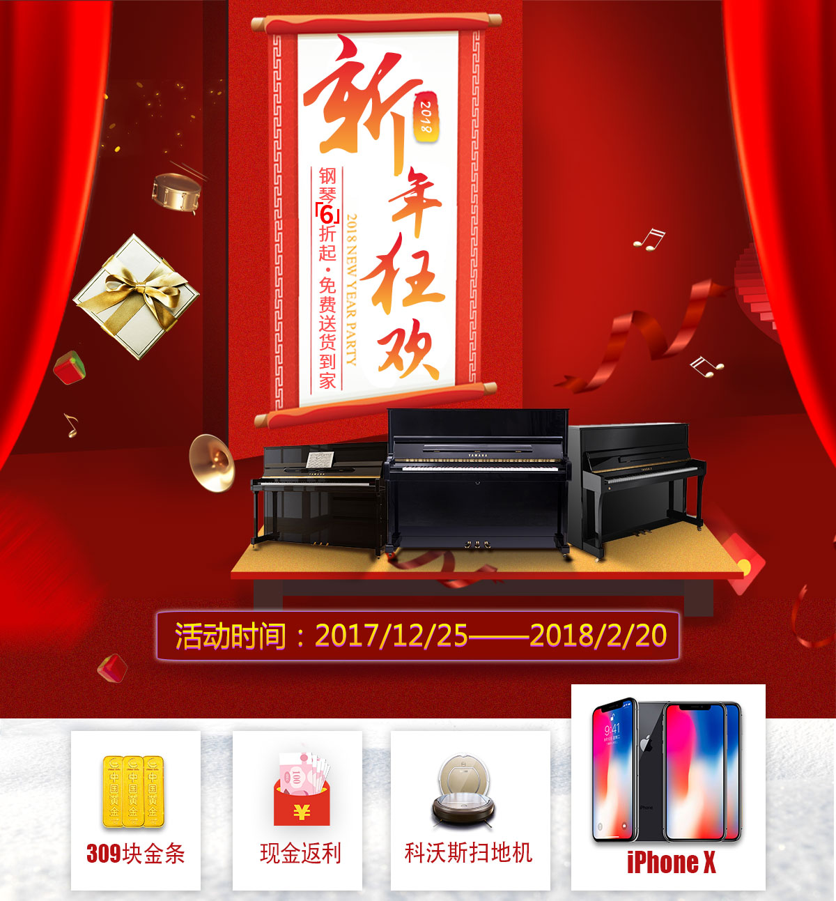 新年·新喜悦,念琴好礼送不停!2017年12月25-2018年2月20部分钢琴6折起,20000份名牌应季礼品,抽中即得,抽完为止,中奖率100%!