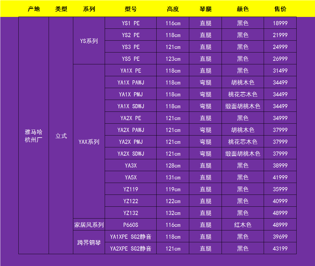 国产雅马哈钢琴主要生产大众价位的立式钢琴,主要型号有YS、YAX、YZ等系列,售价范围在1.5万到4.5万左右。