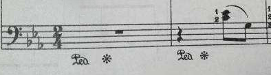 在学五线谱的时候,有关于踏板记号,通常情况右踏板的符号会出行两种情况: