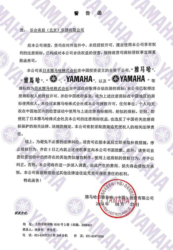 雅马哈致乐和美嘉(现并入欧歌)警告函