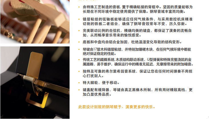 每一处细节都匠心独运,精工细制, 即使您对钢琴设计极其挑剔, 它也不会让您失望。