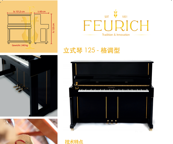 这一型号钢琴是我们最成功型号弗尔里希122-广博型的升级和奢华版。