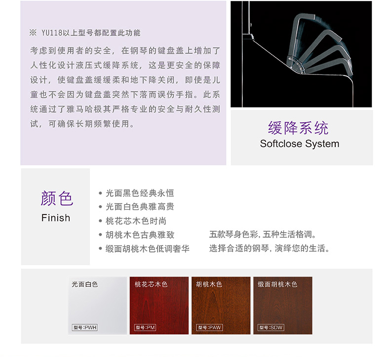 雅马哈YU系列以创造“音・乐”为原点,在细节上极致追求钢琴最本质的卓越性能。其特制的内衬弦槌、精确平均的击弦机、超长的悬挂技术、日本原产V-pro真空铸铁板,集100余年技艺与现代精工于一身,让您享受轻盈灵敏的触键与操控,演绎丰富而深厚的完美音色。此外,其丰富多样的规格配置,更能满足您多元化的喜好需求。具备世界基准的YU系列,每一台都融入了资深造琴师对“音・乐”的毕生热爱。是从初学者到业余爱好者乃至音乐教育家的心爱之选。好的钢琴,育人为上。这就是雅马哈之经典YU系列。